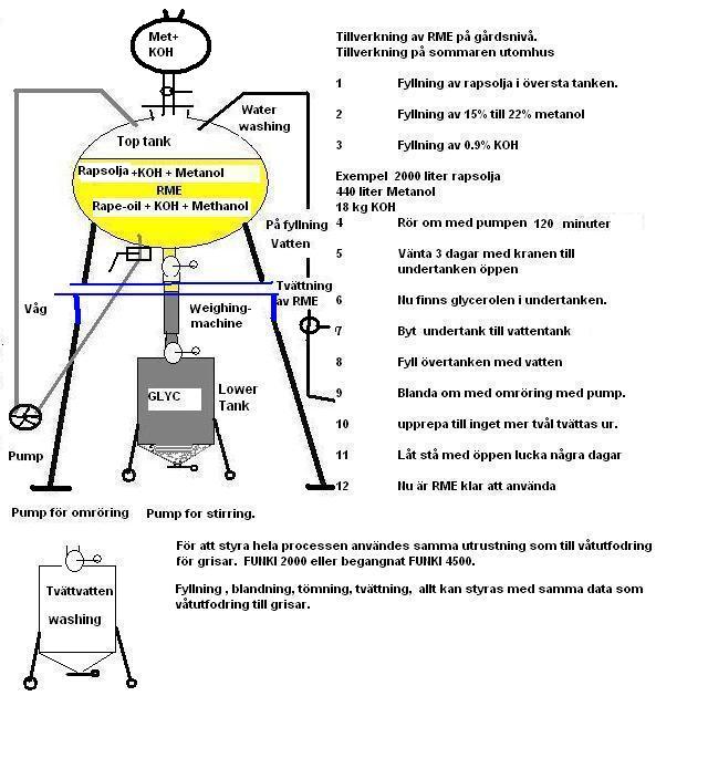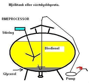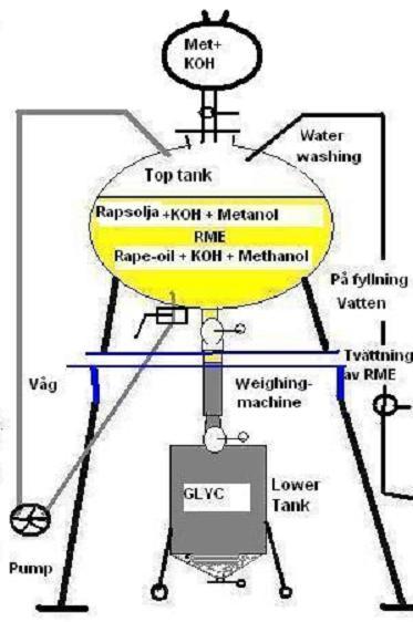 Eftersom glycerolen är tyngre än RME så sjunker glycerolen till den undre tanken utan att behöva pumpa den. Lika med tvättvattnet. Tvättvattnet är tyngre än RME och hamnar i undre tanken också..